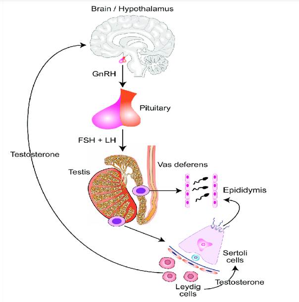 Fig. 1: The hypothalamic-pituitary-testicular axis and its role in spermatogenesis. CCBY 4.0 License -John Reynolds-Wright. Image accessible via https://flic.kr/p/2hgvk5V6A. FSH, follicle-stimulating hormone; GnRH, gonadotropin-releasing hormone; LH, luteinizing hormone[22]
