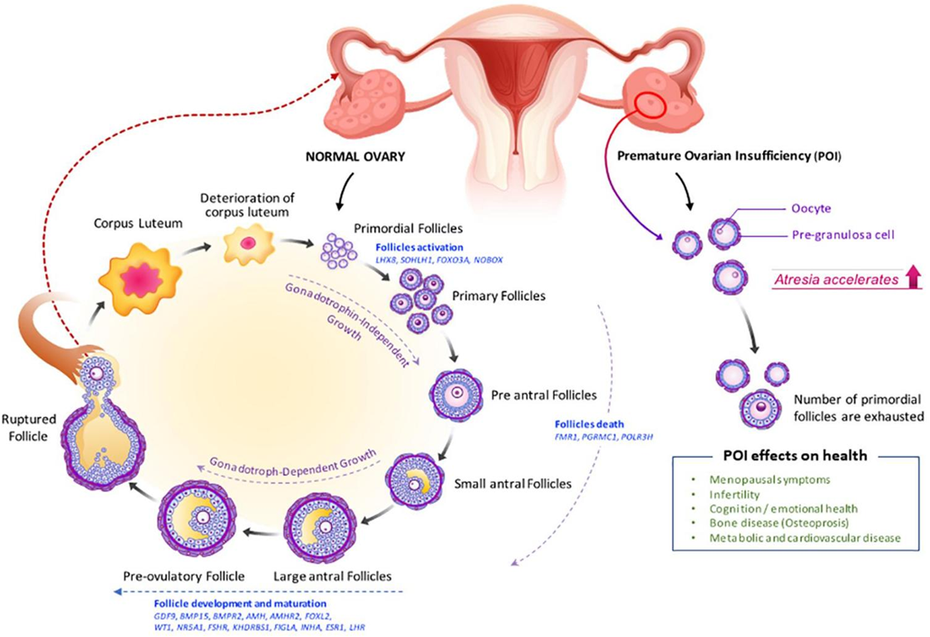 Fig. 2: Folliculogenesis and ovulation in a normal ovary versus POI[48]